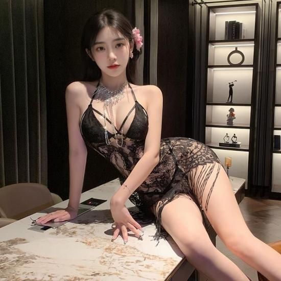 【Meltmeオリジナル】情熱的な夜を彩る、魅惑の「フリンジミニドレスセット」が登場! エレガントなブラックの総レースが、あなたの肌を艶やかに透かし、見る人の視線を釘付けにします。 胸元からウエストにかけての美しい編み上げデザインと、ストラップが交差するオープンバックが、センシュアルな魅力を最大限に引き出します。 裾にあしらわれた軽やかなフリンジ(流苏)は、あなたの動きに合わせて揺れ、挑発的なセクシーさを演出。 同素材のTバックショーツがセットになっており、見えない部分の魅力も完璧です。 Meltmeのフリンジミニドレスで、非日常の官能的なひとときをお楽しみください。