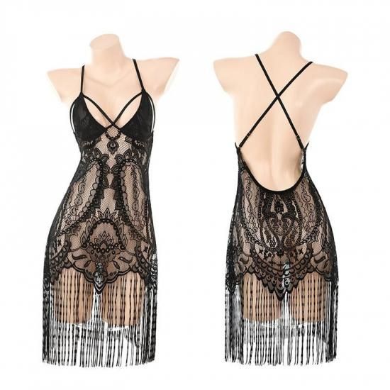 セクシー総レースフリンジミニドレス、Tバックショーツ