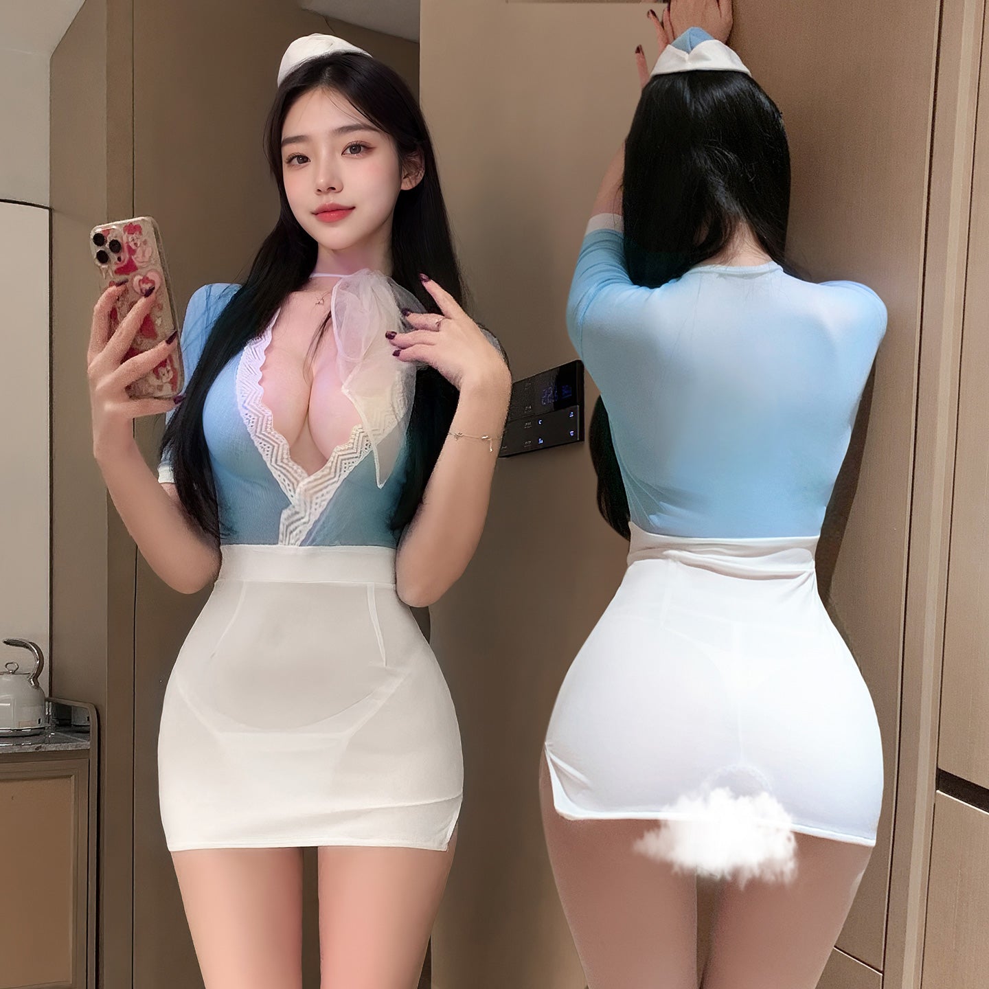 【Meltmeオリジナル】セクシーCA制服 | 超深V露胸&透け感バック・ミニ丈スチュワーデスランジェリー
