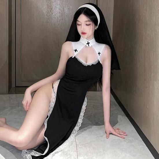 厳かなシスターの雰囲気と、優雅なナースの要素が融合した、ミステリアスで大胆な一着です。肌を覗かせる大胆なカットと繊細なレース使いが、見る人の心を掴んで離しません。